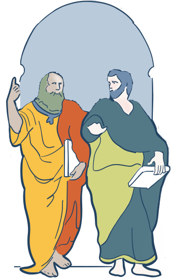 Detail: Plato (left, pointing upward) and Aristotle (right, gesturing outward). The idealist and the pragmatist, walking together. Raphael didn't choose a winner. Neither should we.